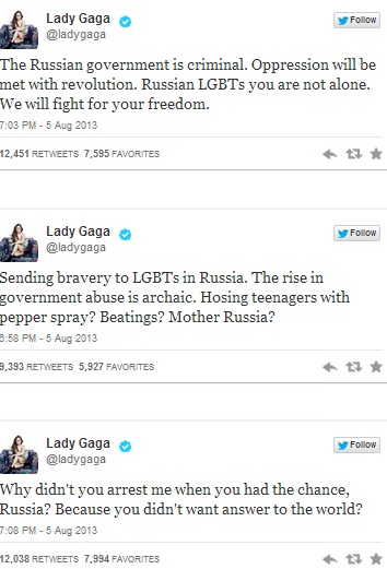 Lady Gaga risponde con una dura replica, via Twitter, alla linea dura adottata da Mosca contro di lei, e contro Madonna, per la loro aperta posizione di condanna delle discriminazioni che subiscono i gay in Russia.