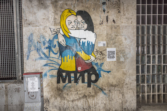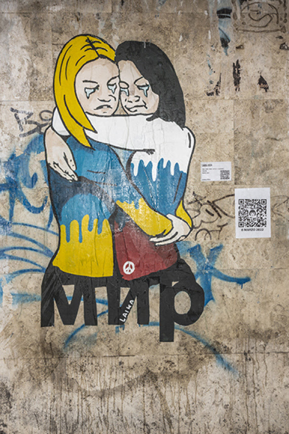 Nella notte tra il 7 e l’8 marzo, la Street Artist Laika ha affisso a piazzale Ostiense (nei pressi della metro Piramide di Roma) la sua nuova opera dedicata alle donne ucraine e russe. Il poster, infatti, raffigura due donne abbracciate e piangenti vestite coi colori delle bandiere ucraina e russa.