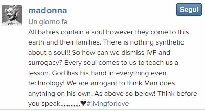 “Tutti i bambini hanno un’anima, indipendentemente da come giungano sulla terra e alle loro famiglie. Non c’è niente di sintetico in un’anima!! Come possiamo rifiutare la fecondazione in vitro e la maternità surrogata? Ogni anima viene per insegnarci una lezione. Dio mette la sua mano in ogni caso, anche nella tecnologia! Siamo arroganti se pensiamo che l’uomo faccia tutto da solo. Pensate prima di parlare”.