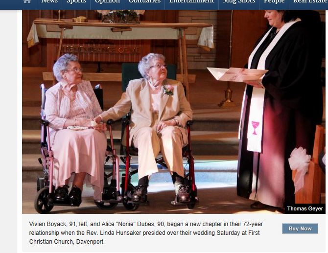 IOWA (USA) – Dopo 72 anni di fidanzamento, si sposano: le protagoniste di questa storia d’amore sono Vivian Boyack e Alice “Nonie” Dubes, due 90enni americane, che dopo una lunga attesa hanno visto coronare il proprio sogno e, al cospetto del reverendo Linda Hunsaker nella First Christian Church di Davenport, nell’Iowa, si sono unite in matrimonio lo scorso sabato.