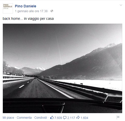 Scrive l’Ansa: “Pino Daniele si sarebbe sentito male nella sua casa di campagna in Toscana, secondo quanto riferisce Il Mattino, citando il figlio e tour manager del cantante, Alessandro. La corsa nel tentativo di prestargli soccorso sarebbe stata vana”.