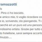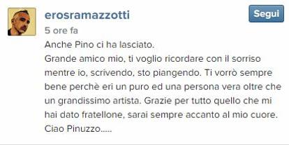 Il primo a dare la tragica notizia sul web è stato l’amico e collega Eros Ramazzotti che ha postato una foto del cantante sorridente, scrivendo: “Anche Pino ci ha lasciato. Grande amico mio, ti voglio ricordare con il sorriso mentre io, scrivendo, sto piangendo. Ti vorrò sempre bene perché eri un puro ed una persona vera oltre che un grandissimo artista. Grazie per tutto quello che mi hai dato fratellone, sarai sempre accanto al mio cuore. Ciao Pinuzzo”.