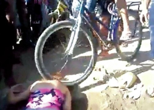 Mentre la donna è per terra viene colpita a turno. Un uomo le alza la testa per poi sbattergliela al suolo, un altro le passa sopra con una bicicletta mentre un terzo le lega una corda al polso e poi la trascina.