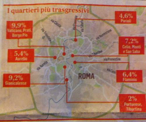 Il sito diffonde anche una classifica delle zone romane più trasgressive: l’area intorno al Vaticano, ovvero Prati e Borgo Pio è al primo posto con il 9,9%, secondo posto per la Gianicolense con il 9,2%, seguono Celio, Monti e San Saba con il 7,2% e poi il Flaminio con il 6,4%. Solo 4,6% per i Parioli.