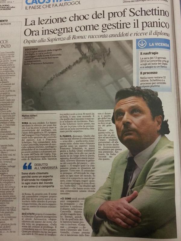 ROMA – Schettino avrebbe tenuto una “lezione” all’Università La Sapienza di Roma, intrattenendo gli studenti in merito alla “gestione del panico”. Questa notizia che sta facendo il giro del web è in realtà una mezza verità, o mezza bufala, come si preferisce.