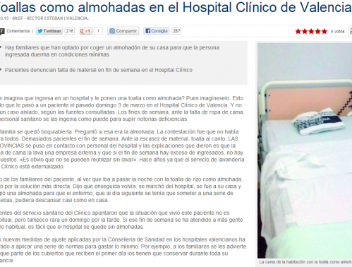La testimonianza è arrivata sul sito Lasprovincias.es da uno dei degenti dell’Hospital Clinico di Valencia. Entrato nella sua stanza ha trovato sul letto, al posto del cuscino, un asciugamano. Ha scattato le foto e le ha spedite al quotidiano online. Solo dopo ha scoperto che il suo non era un caso isolato…