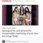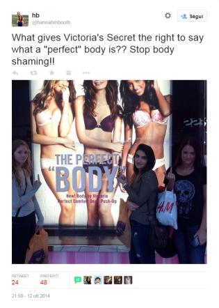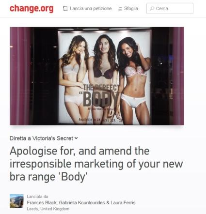 “Vorremmo che Victoria’s Secret chiedesse scusa e si assumesse le proprie responsabilità per il dannoso e malsano messaggio che il loro claim “The perfect body” manda alla società in merito al corpo delle donne e a come dovrebbe essere giudicato. Vorremmo anche che Victoria’s Secret cambiasse il suo claim pubblicitario in qualcosa che non promuova malsani e irrealistici standard di bellezza, e che promettesse di non usare più queste dannose pubblicità in futuro”