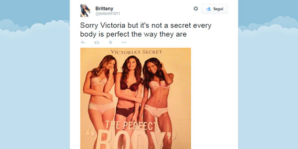 Basta taglie 38, basta pubblicità che inneggiano a corpi perfetti al limite della realtà. Dopo la petizione lanciata sul web, anche su Twitter è partita una campagna che contesta i modelli surreali di Victoria’s Secret. “Angeli” che, nella loro “perfezione”, contribuiscono a far crescere soprattutto nelle adolescenti quel senso di inadeguatezza e quella voglia di diventare sempre più magre e perfette.