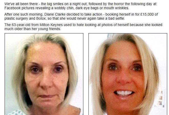 LONDRA – Spende 19mila euro in chirurgia per un viso a prova di “selfie”. Secondo quanto riportato dal DailyMail, Diane Clarke, donna inglese di 63 anni, ha deciso di ricorrere al lifting e al botox per apparire in modo perfetto nei suoi autoscatti.(FOTO: clicca qui)
