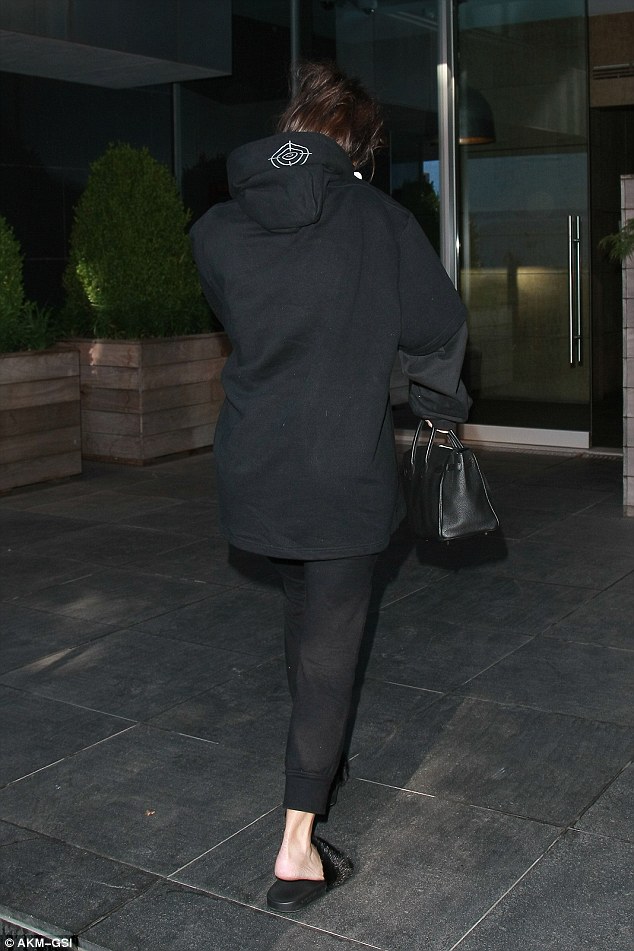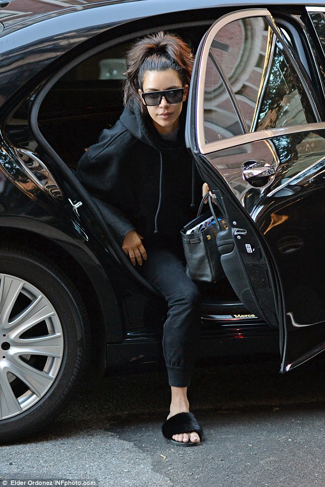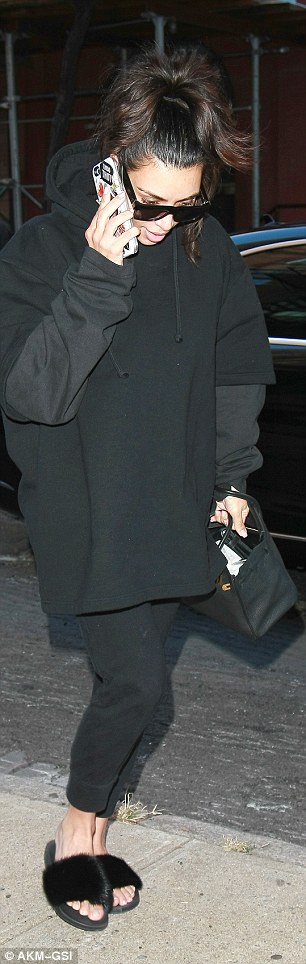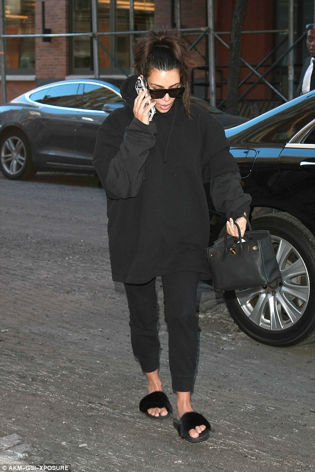 NEW YORK – Kim Kardashian durante la New York Fashion Week ha indossato abiti appariscenti tra cui un top che da cui spuntavano i suoi capezzoli. Lunedì però, l’attrice e showgirl di 35 anni è tornata ad una certa sobrietà e si è presentata in strada con una felpa nera firmata dal marito Kanye West Yeezy e dei pantaloni dello stesso colore. Ai piedi, Kim indossa delle scarpe che sembrano delle ciabatte da doccia. L’unica differenza è che queste sono felpate. Sotto braccio una bella borsa Hermes Brikin di qualche stagione fa.
