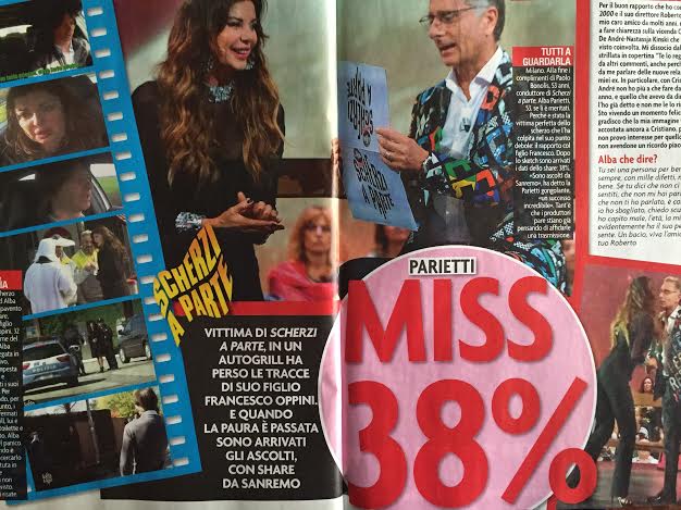 MILANO – Alba Parietti regina della tv: con lei lo share schizza al 38%. Vittima del programma Scherzi A Parte, con il suo sketch a portato gli ascolti a livelli che farebbero invidia a ogni trasmissione. Lo scherzo riguardava suo figlio, Francesco Oppini, 32 anni, cui Alba è legata in maniera ossessiva, tanto che lo tempesta di messaggi e chiamate. I due si sono fermati in Autogrill, lui è andato in bagno e non è più tornato. Lei è ovviamente entrata nel panico. Quando è entrata dentro per cercarlo, le è stato riferito che nessuno lo aveva visto. Paura e terrore che poi sono venute meno quando ha scoperto la verità. A quanto pare però la sua reazione ha tenuto appiccicati alla tv un bel po’ di italiani, che sono stati tutti a guardare la sua disavventura. “Sono ascolti da Sanremo”, ha commentato la Parietti, secondo quanto riportato dal settimanale Novella 2000, che scrive: “Tant’è che i produttori pare stiano già pensando di affidarle una trasmissione”.