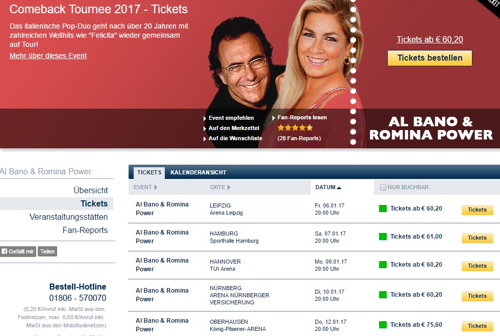 Ora, finalmente, arrivano 2 notizie certe, una buona e una cattiva. Quella cattiva è che, effettivamente, i concerti sono stati posticipati e quindi a novembre non ci sarà alcun tour. Una triste notizia per tutti quei fan italiani che, pur di poter vedere i 2 cantanti riuniti su un palco, avevano già acquistato biglietti di voli e treni per raggiungere Albano e Romina in Germania. Ora però la buona notizia: se è vero che il concerto è stato posticipato, almeno si sanno già le date esatte. Il tour avrà luogo a gennaio 2017, precisamente nella date dal 6 al 12 gennaio 2017. Chi ha acquistato i biglietti per le date di novembre, può fare richiesta di rimborso oppure semplicemente richiedere di poter cambiare la data. Certo, però, farsi rimborsare soldi di aerei e treni sarà più difficile.