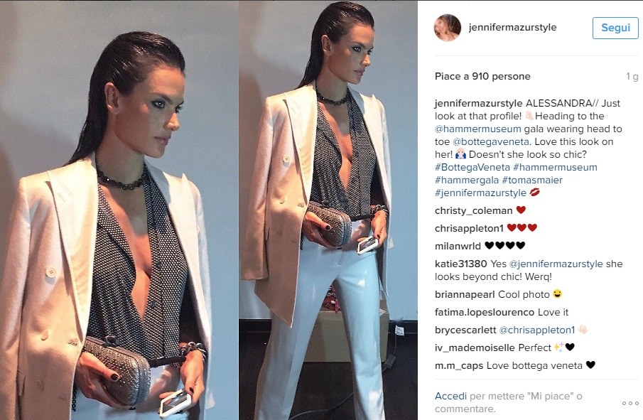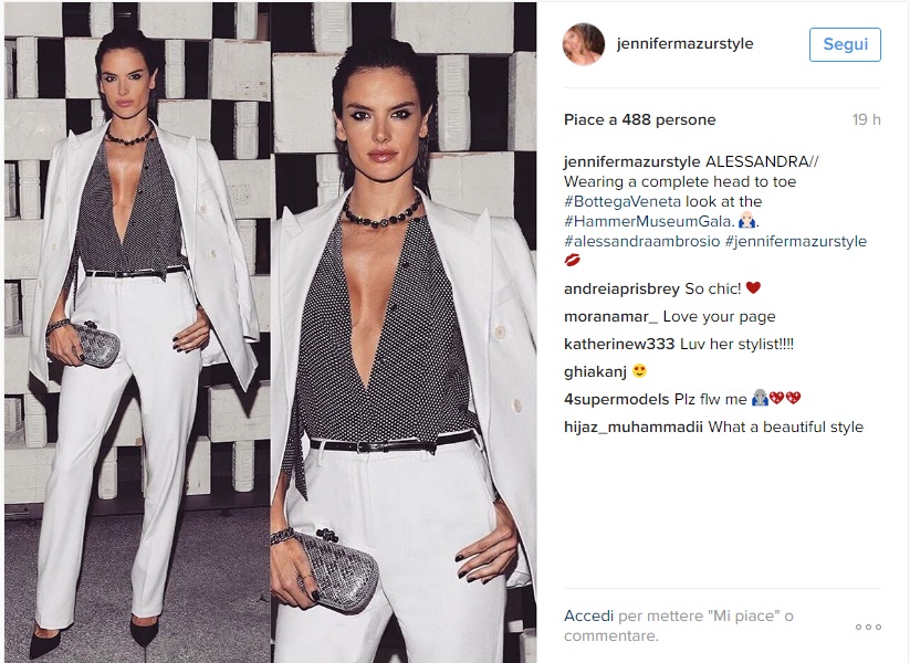 la modella 35enne è apparsa con una camicia sbottonata che non nasconde (volutamente) il seno. Si tratta di un abito bianco di Bottega Veneta (costo 700 euro) in doppio petto accompagnato con una camicia blusa a pois. I pantaloni che indossa la modella brasiliana sono a vita alta che mettono in risalto le sue gambe lunghe.