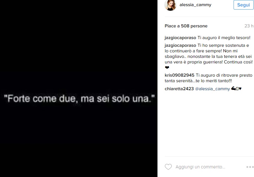 Purtroppo per i fan della coppia Alessio-Aldo, però, sembra che sul fronte della relazione nata a Uomini e Donne non sia cambiato nulla. Il matrimonio tra i due è definitivamente finito e non sembra che ci sia speranza di un ritorno di fiamma. Proprio a “Uomini e Donne”, Palmeri ha rivelato di non essere più innamorato della moglie e l’ha invitata a guardare avanti, cosa che per lui era già avvenuta. La disperazione della Cammarota ha intenerito i fan della coppia che, ancora una volta, hanno bersagliato l’ex tronista con tutta una serie di rimproveri. Trascorsa qualche settimana da quella puntata andata in onda a Uomini e Donne, Alessia è tornata su Instagram interrompendo di fatto il silenzio.