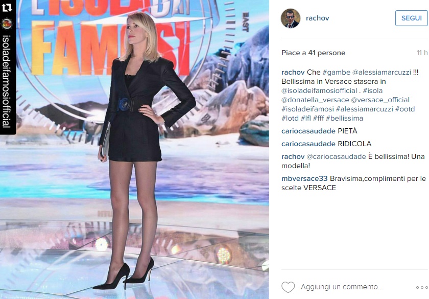 Che dire, anche questa volta il look di Alessia Marcuzzi è stato perfetto. Così, anche se la terza puntata dell’Isola ha visto una vera e propria umiliazione, con Rai 2 che ha doppiato gli ascolti trasmettendo una replica del “Commissario Montalbano”, almeno la conduttrice del reality in fatto di look non si smentisce mai. Anche questa volta come la scorsa edizione, la conduttrice si è affidata alla casa di moda italiana Versace per essere impeccabile. Molto successo ha avuto anche l’abito indossato da Alessia Marcuzzi durante la prima puntata dell’Isola dei Famosi: un modello nero monospalla con tacco. Un capo elegante che metteva in evidenza il fisico slanciato di Alessia.