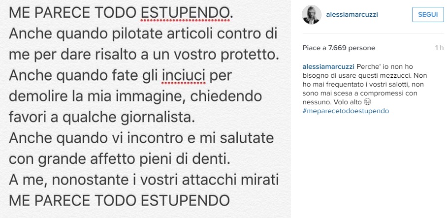 “Anche quando pilotate articoli contro di me per dare risalto a un vostro protetto. Anche quando fate gli inciuci per demolire la mia immagine, chiedendo favori a qualche giornalista. Anche quando vi incontro e mi salutate con grande affetto pieni di denti. A me, nonostante i vostri attacchi mirati ME PARECE TODO ESTUPENDO”. “Perché io non ho bisogno di usare questi mezzucci. Non ho mai frequentato i vostri salotti, non sono mai scesa a compromessi con nessuno. Volo alto”.