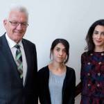 Nadia Mourad è stata candidata al premio Nobel per la Pace 2016, per il suo attivismo, e già a dicembre aveva raccontato la sua storia al Consiglio di Sicurezza dell’Onu, commuovendo il mondo. Nelle foto che seguono pubblicate dall’Ansa, la 19enne è con Amal Alamuddin Clooney e con il ministro federale dello stato Baden-Wuerttemberg Winfried Kretschmann, a Stoccarda in Germania.