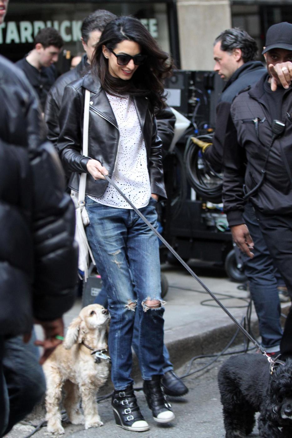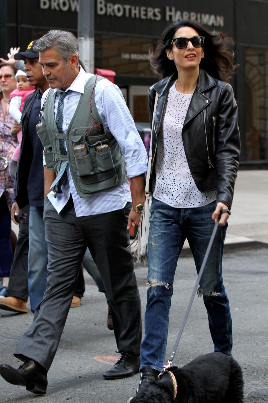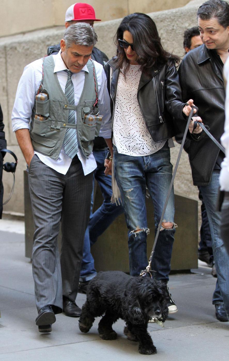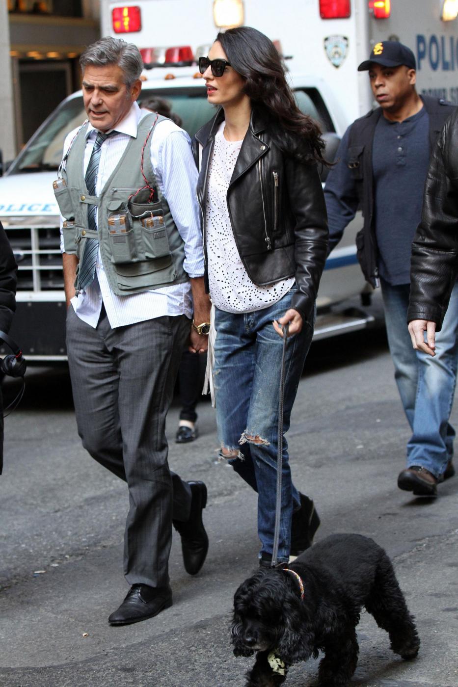NEW YORK – Amal Alamuddin va a trovare George Clooney sul set del film “Money Monster” a New York. (Vedi anche: Amal Alamuddin magrissima, LE FOTO). E perché la sorpresa per il suo sposo fosse completa, l’avvocato ha portato con sé anche il cagnolino dell’attore, Einstein, adottato nel 2010. Il quadretto di famiglia è a questo punto completo. La moglie del divo ha scelto un look piuttosto semplice: jeans strappati e cappotto in pelle nera con scarpe sportive. Abito di scena invece per lui.
