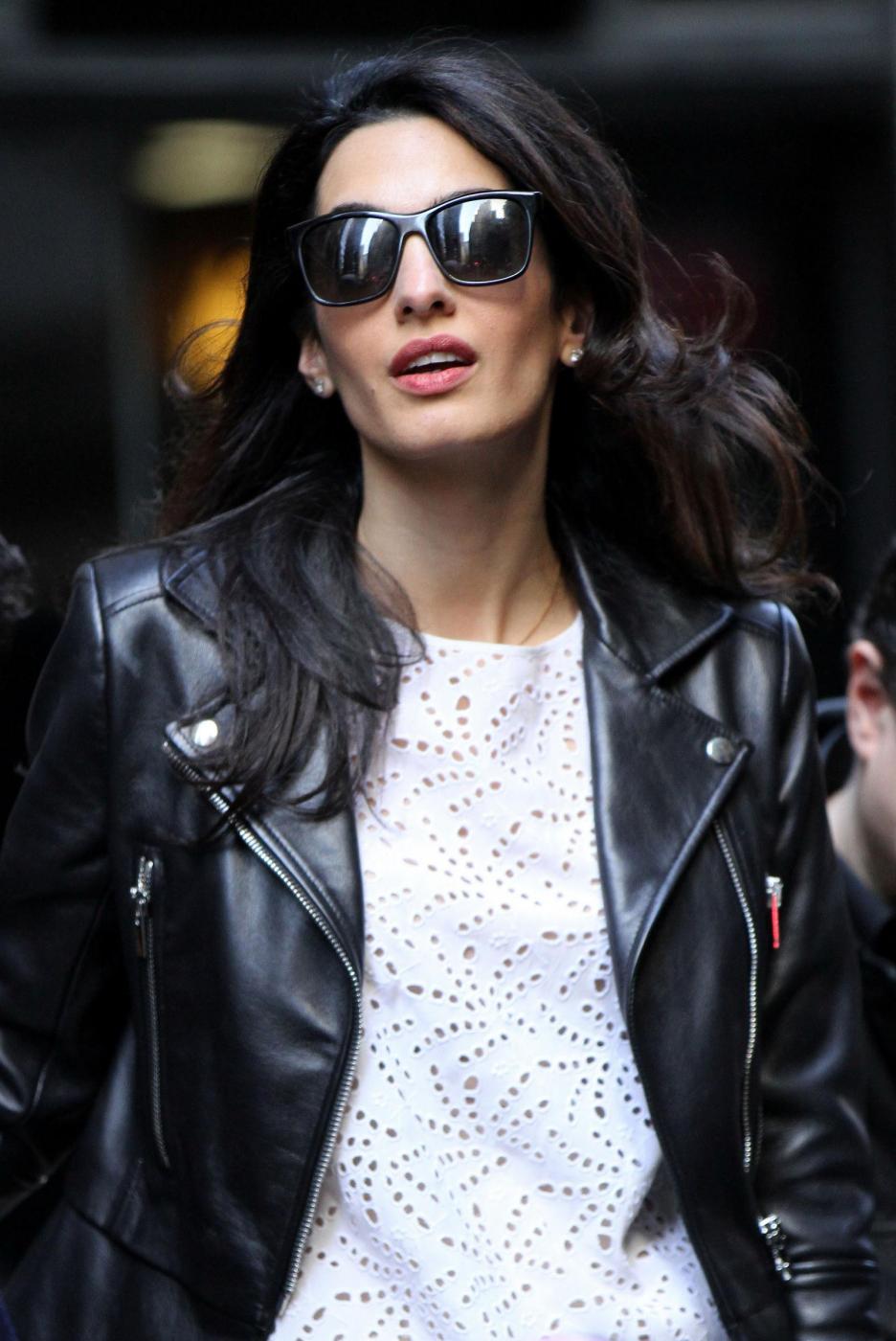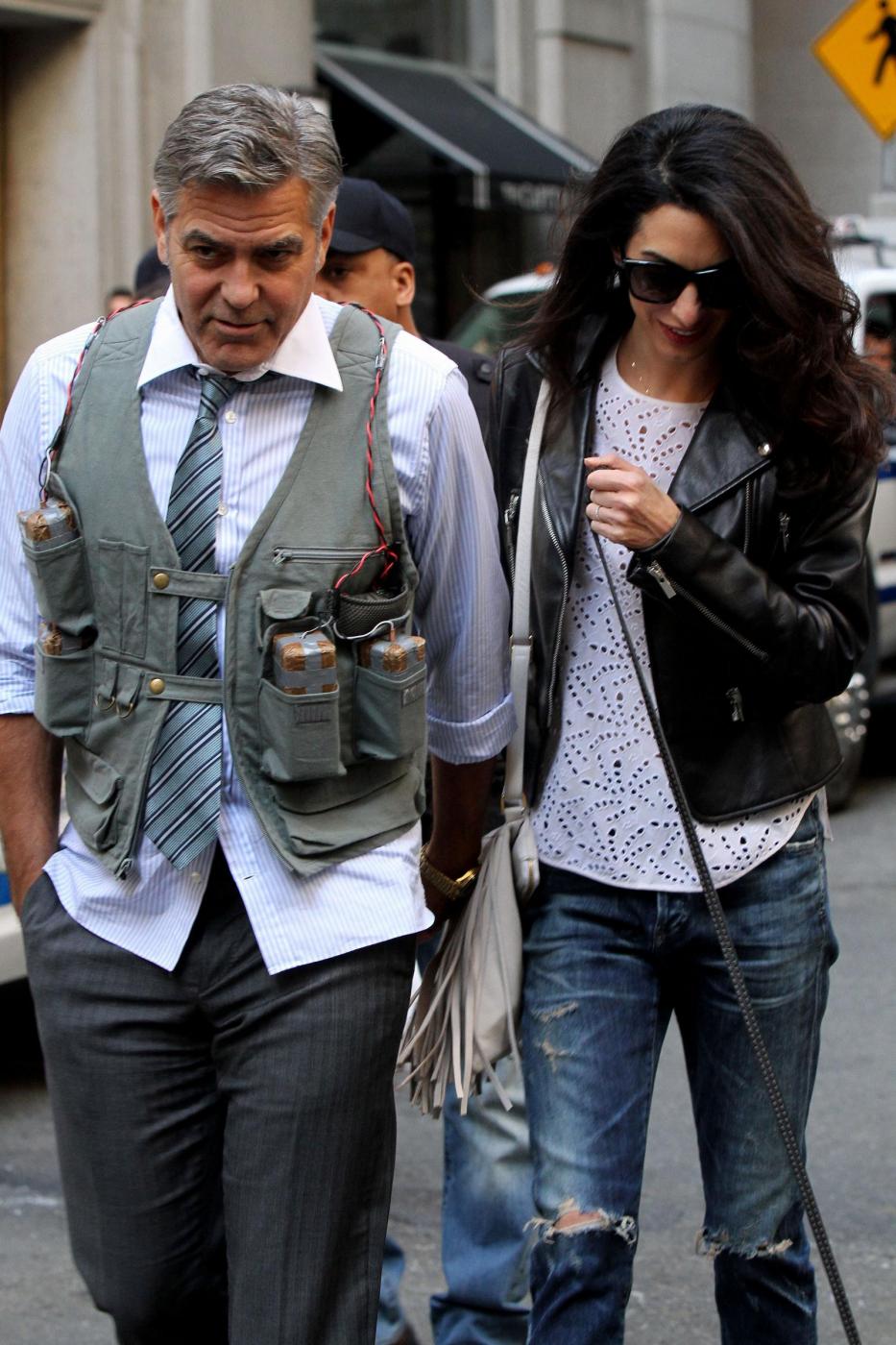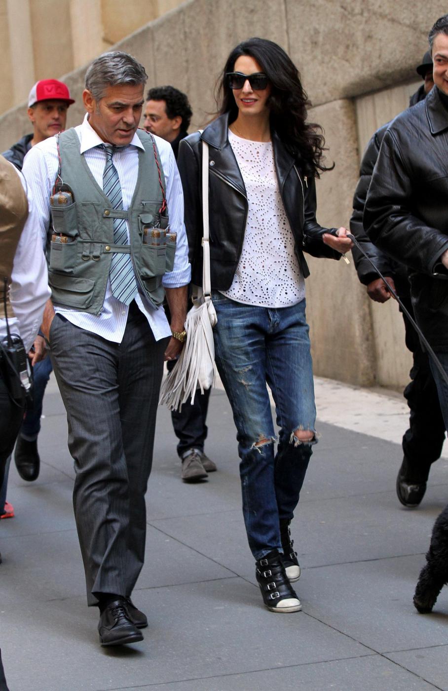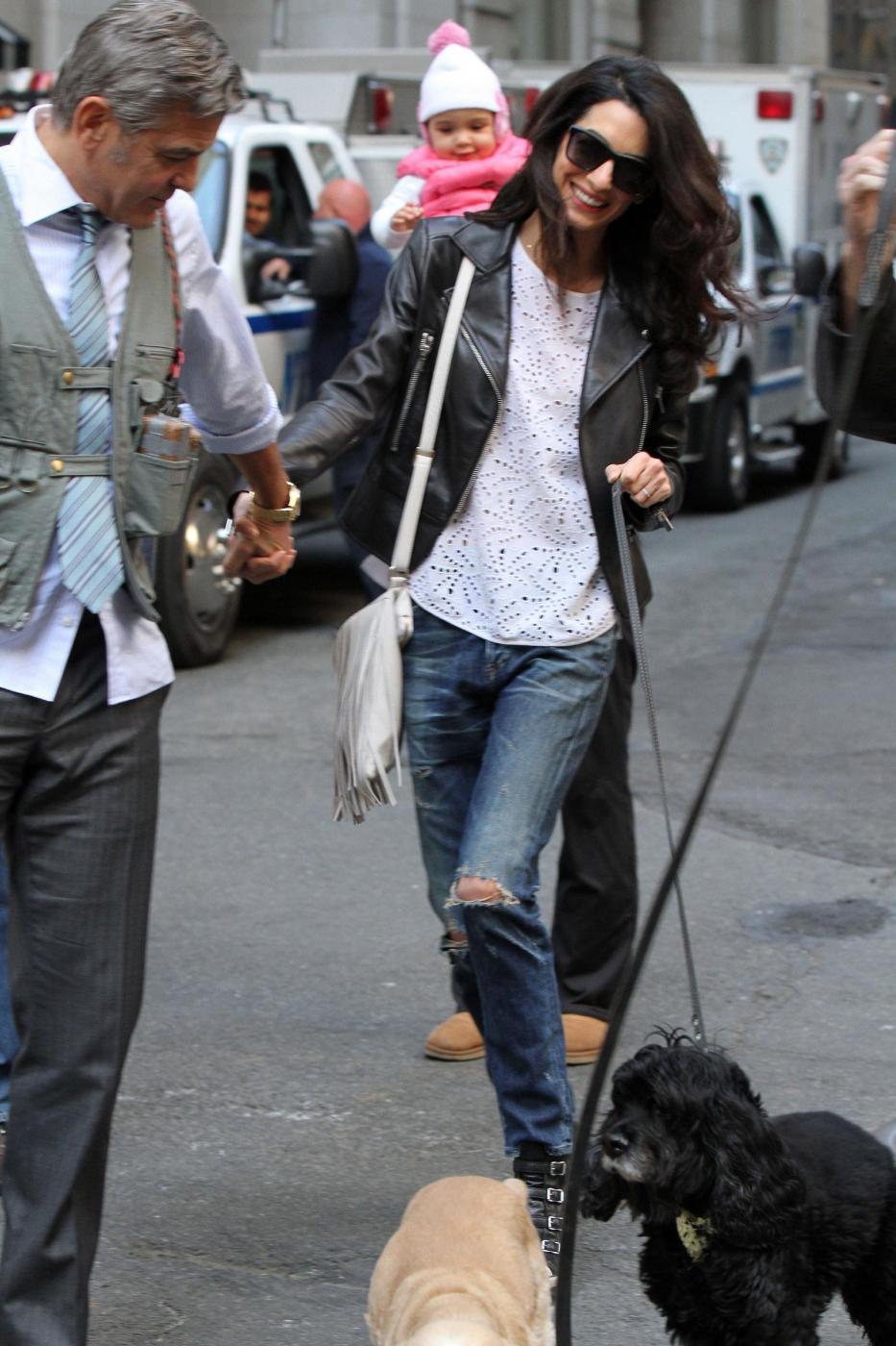 NEW YORK – Amal Alamuddin va a trovare George Clooney sul set del film “Money Monster” a New York. (Vedi anche: Amal Alamuddin magrissima, LE FOTO). E perché la sorpresa per il suo sposo fosse completa, l’avvocato ha portato con sé anche il cagnolino dell’attore, Einstein, adottato nel 2010. Il quadretto di famiglia è a questo punto completo. La moglie del divo ha scelto un look piuttosto semplice: jeans strappati e cappotto in pelle nera con scarpe sportive. Abito di scena invece per lui.