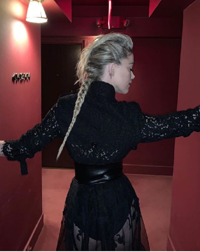 La Amber è stata aiutata a scegliere questo look da Rob Zangardi, il suo stylist personale, che le fatto indossare dei guanti di rete e pumps a punta nere a contrornare il tutto. Da notare anche il retro dell’outfit, con una lunga treccia bionda. A realizzare questo secondo outfit è stato invece il suo hairstylist personale Renato Campora.