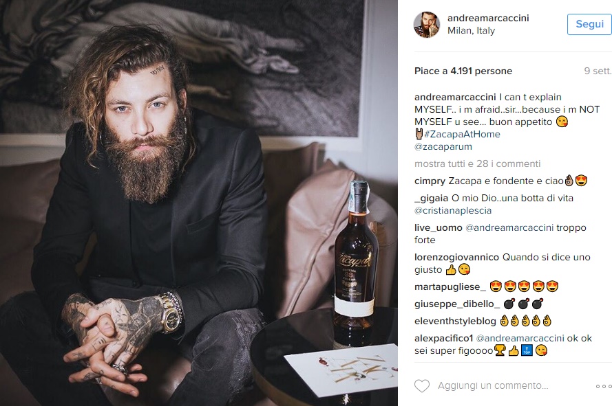 ROMA – Andrea Marcaccini: età, fidanzata, altezza FOTO. Barba selvaggia e una cascata di tataggi: Andrea Marcaccini, naufrago dell’Isola dei Famosi 12 in onda su Canale 5 in prima serata, siamo certi che farà parlare molto di sé. Classe ’88, Andrea Marcaccini ha 28 anni e, nonostante sia poco noto al pubblico televisivo, è molto famoso tra gli appassionati di moda. Il suo profilo Instagram vanta già 120mila fan ed è molto apprezzato per i suoi stilosi tatuaggi e per la sua barba. Alto 192 cm, Andrea Marcaccini è nato a Messina ma è cresciuto in Romagna e di professione fa il modello: ha iniziato a sfilare all’età di 16 anni. Non solo: la moda è da sempre la sua passione e da poco ha presentato anche una collezione tutta sua.