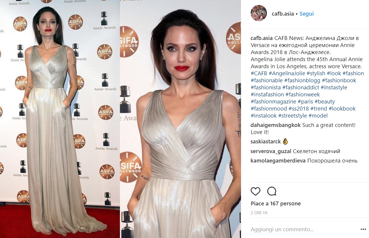 LOS ANGELES – Angelina Jolie divina in abito lungo Atelier Versace FOTO. In questi giorni Angelina Jolie sta dando davvero il meglio di sé in fatto di look. Dopo gli outfit super chic di Parigi, eccola sul red carpet del 45h Annual Annie Awards a Los Angeles in un meraviglioso abito Atelier Versace. Si tratta di un elegantissimo e impalpabile abito lungo con vita a impero, grigio perla in satin, corpetto incrociato e spacco vertiginoso.