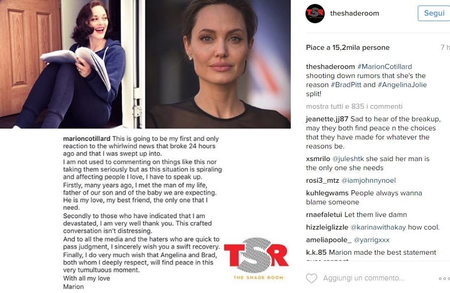 Ora, dopo l’annuncio del divorzio tra Brad e Angelina, sono tornati prepotenti i gossip in merito alla relazione tra Pitt e la Cotillard. Ad alimentare ancora di più il gossip, la notizia secondo cui Marion Cotillard sarebbe incinta. Sentitasi chiamata in causa, Marion ha deciso di rompere il silenzio e, per la prima volta nella sua vita, decide di raccontare personalmente la verità su tutta la faccenda. Lo fa attraverso il suo profilo Instagram, in cui spiega per filo e per segno cosa c’è tra lei e Brad Pitt: