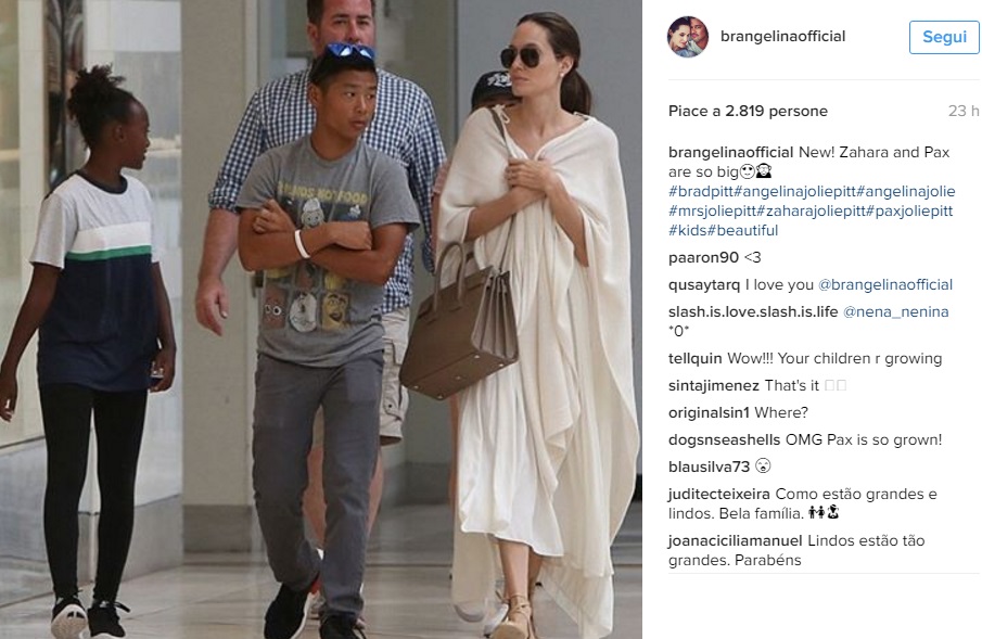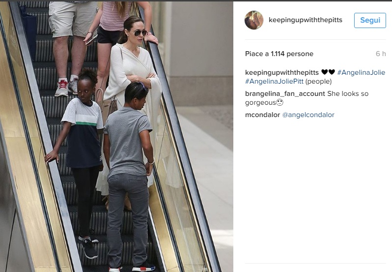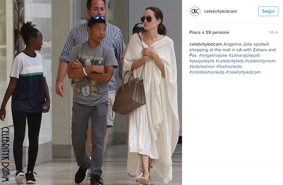 ROMA – Angelina Jolie in total white. Ecco come nasconde la sua magrezza. L’attrice americana posta delle foto su Instagram in cui appare insieme ad alcuni dei suoi (numerosi) figli. La Jolie, negli scatti sembra trovarsi all’interno di un centro commerciale e come spesso accade negli ultimi tempi indossa degli abiti senza forma. Si tratta di vestiti lunghi e grossi che nascondono il fatto che è magrissima.