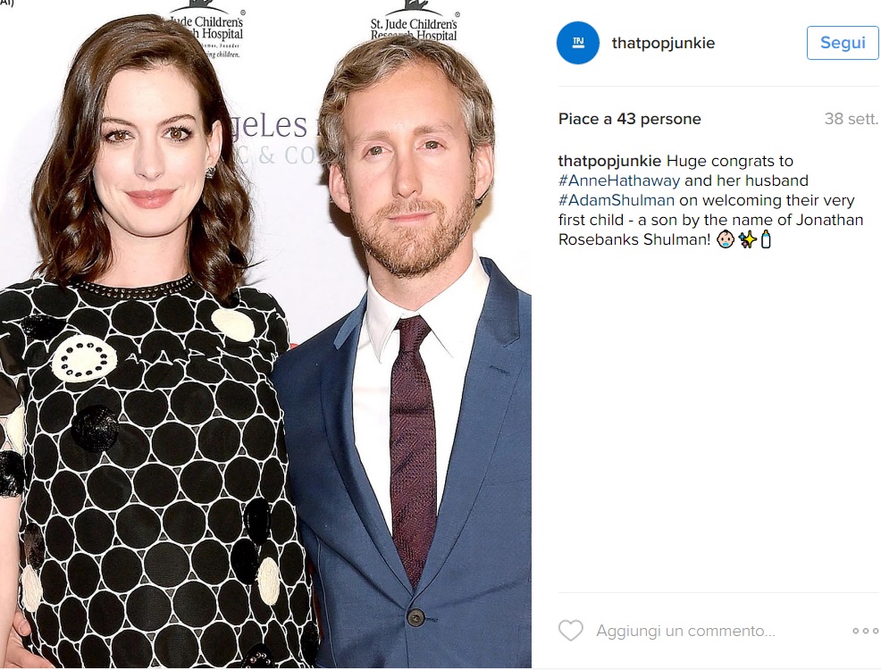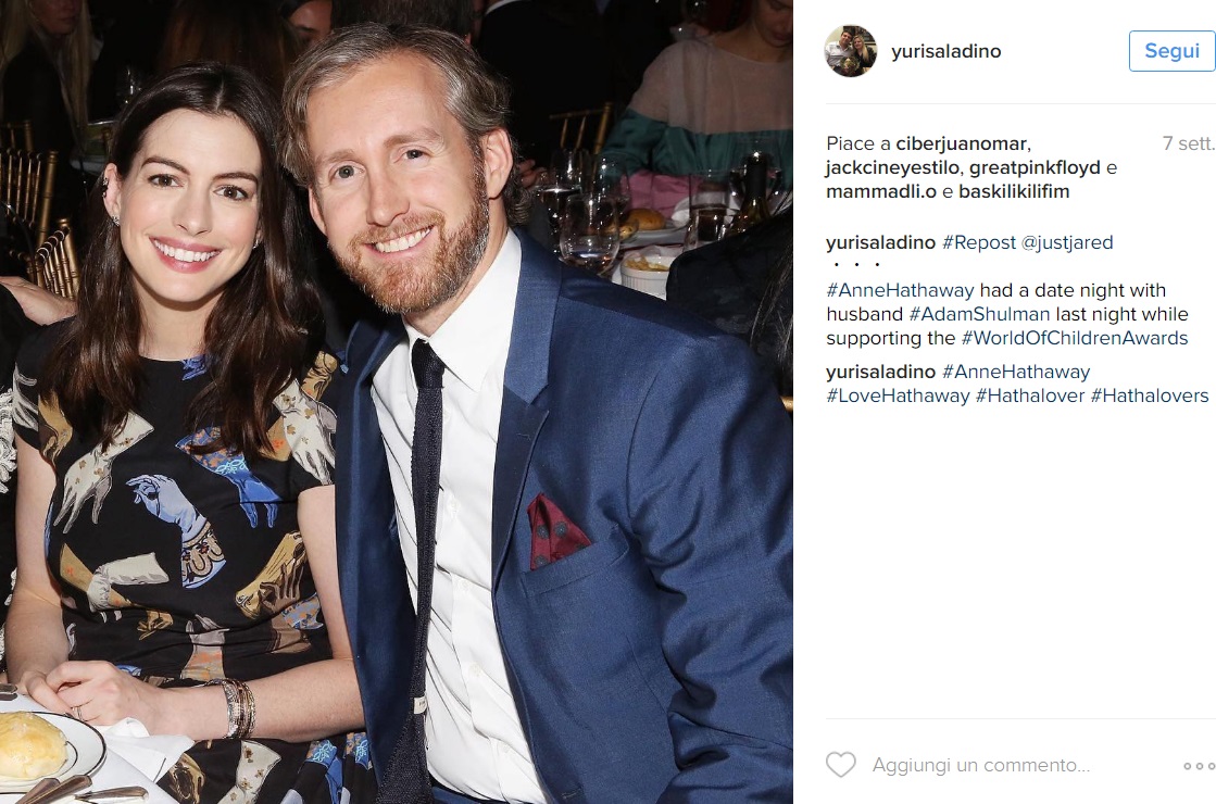 Ma Adam non è stato il primo fidanzato dell’attrice. Il suo primo flirt noto ai gossip è stato l’attore Topher Grace, che ha frequentato tra il 1999 e il 2001. In seguito l’attrice ha avuto una storia con Hugh Dancy, il protagonista di Black Hawk Down, ma nel 2005 Anne ha messo fine alla relazione. La Hathaway ha dovuto chiudere anche con l’imprenditore Raffaello Follieri quando una delle organizzazioni benefiche di lui è finita sotto indagine per frode fiscale. Dopo un flirt con Josh Lucas, Anne ha iniziato a frequentare nel 2008 il meno noto attore Adam Shulman. Il fidanzamento è stato ufficializzato nel novembre 2011. I due si sono sposati nel 2012 a Big Sur, in California, in una cerimona interreligiosa ebraico-cristiano.