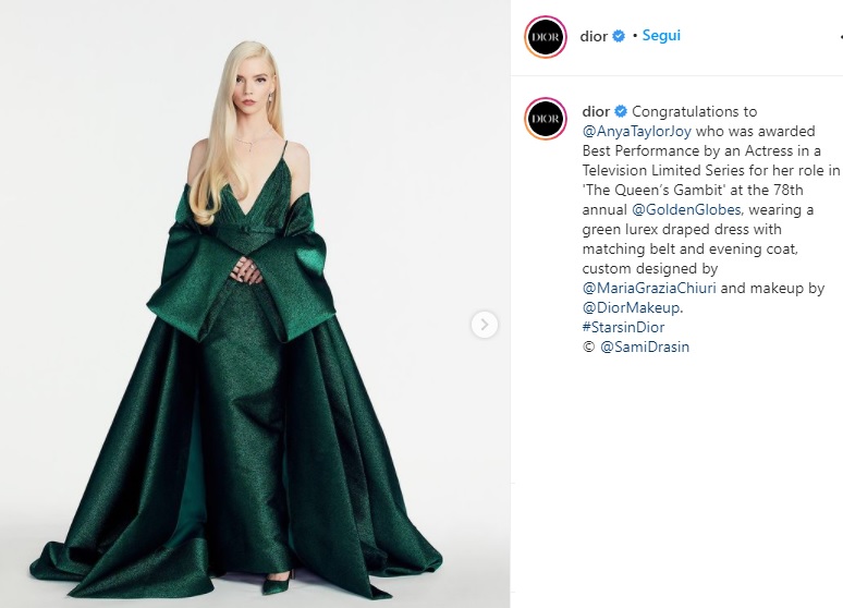 Per festeggiare questo momento speciale Anya Taylor-Joy ha indossato un abito verde smeraldo formato Dior, disegnato dalla stilista Maria Grazia Chiuri.