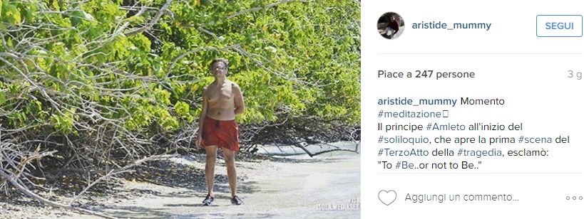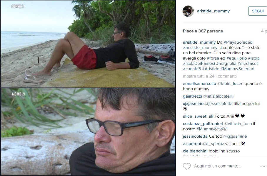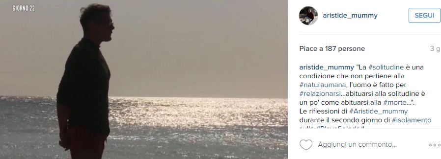 Aristide si riferisce al serale di lunedì, quando si saprà la decisione del pubblico in merito all’eliminazione dall’Isola di Aristide o Simona Ventura, rivali in nomination di questa settimana. Nonostante Aristide non sia un personaggio molto noto, sta diventando il vero “eroe” di questa edizione dell’Isola. Da solo su Playa Soledad, poi, con i suoi problemi fisici e la solitudine, offre al pubblico riflessioni sulla storia e sul mondo a dir poco interessanti…