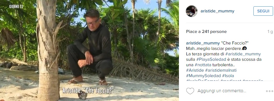 Tempi duri per “Mummy”, ovvero l’archeologo Aristide Malnati: dopo la momentanea eliminazione a seguito dell’utilizzo (vietato) dell’accendino per accendere il fuoco Aristide è finito, completamente solo, a Playa Soledad, l’isola che di fatto ha preso il posto di Playa Desnuda. L’egittologo, costretto a vivere completamente solo, aiutato da un miserissimo kit di sopravvivenza, non se la sta passando molto bene tanto che nelle ultime ore è stato necessario l’intervento di un medico. Ma andiamo con ordine: tutto è iniziato quando Aristide ha accusato, durante la notte, fortissimi dolori dovuti probabilmente al fatto di aver mangiato dei paguri crudi. L’archeologo è stato preda di vomito e insonnia tanto che il dottore presente sull’Isola -che segue a distanza i naufraghi per intervenire in caso di necessità estrema- ha deciso di intervenire e sottoporre Malnati a una flebo. L’egittologo molto amico di Alfonso Signorini ha poi dichiarato: