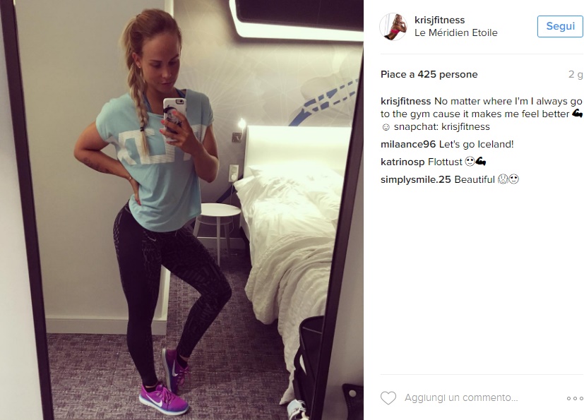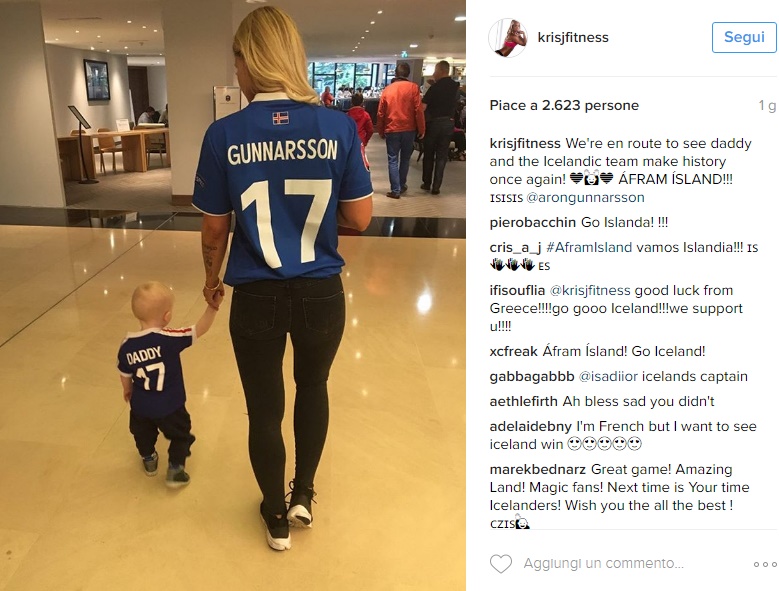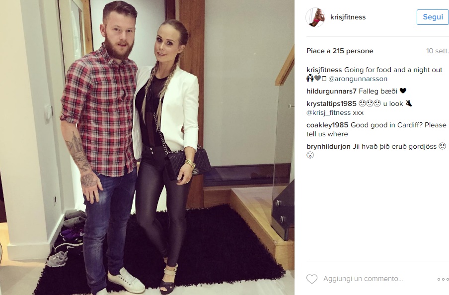 Ma chi è questa ragazza che ha rapito il cuore non solo del bel calciatore ma anche del popolo islandese e dei fan degli Europei 2016? Kris ha 27 anni e di professione fa la modella e la persona trainer. Bionda, occhi azzurri, la fidanzata del capitano della nazionale islandese ha un fisico davvero perfetto, slanciato e atletico. Dopotutto il fitness deve essere per lei una passione prima che un lavoro a giudicare dalle moltissime foto che posta su Instagram in cui appare in palestra e in versione “workout”. Non solo, la modella -che ha anche lanciato una sua linea di creme abbronzanti- e Aron Gunnarsson hanno anche un bambino, Oliver Breki.