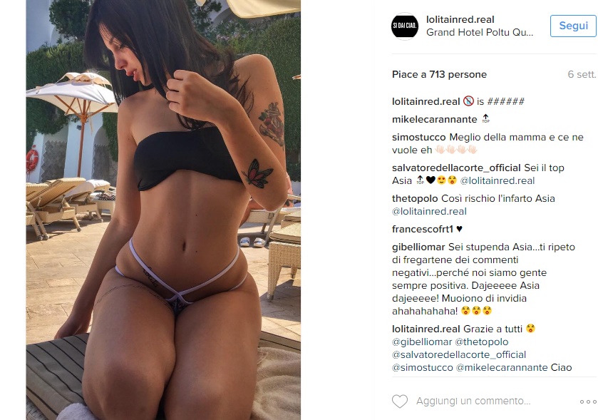 Lolita: questo è il nome che Asia ha scelto come nickname sui Social. E proprio questo nome la giovane se lo è tatuato sull’inguine. Sul suo corpo vi è anche la scritta “Lolita in red” e n un’intervista rilasciata in passato, al settimanale ‘Chi’, spiegò come mai è così legata al personaggio nato dalla penna di Nabokov: