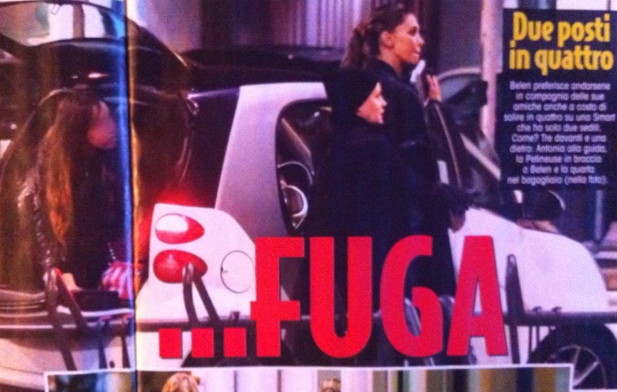 Ma lo show di Belen non finisce qui perché non solo appena vede i fotografi di Novella2000 risponde con un eloquente dito medio alzato, ma a fine serata -quando l’allegra famiglia decide di andare via- Belen sale su una macchina modello Smart, notoriamente per 2 passeggeri… insieme ad altre 3 persone. Come? “3 davanti -scrive Novella2000- e 1 dietro, nel bagagliaio”. Che dire, un vero e proprio disastro di galateo comportamentale. Foto: Novella2000.