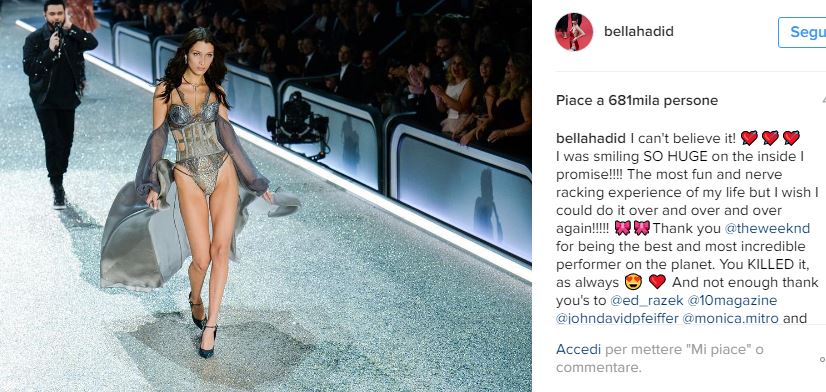 Bella Hadid e The Weeknd tornano insieme? Ai più attenti non è sfuggita una frase scritta dalla modella a commento di una foto postata sulla sua pagina Instagram. Si tratta di uno scatto relativo all’ultima sfilata Victoria’s Secret, in cui la sorella di Gigi è stata una delle protagoniste assolute. “Grazie per essere il migliore e più incredibile performer del pianeta”, ha scritto taggando il rapper. Tanto è bastato a far sperare i fan della coppia di rivederli insieme. Merito anche del siparietto andato in scena durante lo show tra Bella e il suo ex fidanzano Abel Tesfaye (nome d’arte di The Weeknd). Lui è stato uno dei cantanti che si sono esibiti in passerella. Quando la sua ex, Bella Hadid, gli è passata davanti, i due si sono scambiati uno sguardo complice. La rottura non è mai stata confermata, ma neanche smentita. “Siamo buoni amici”, avrebbe dichiarato la modella alle sue amiche prima di partire per Parigi, dove si è tenuta la sfilata.