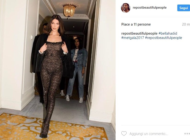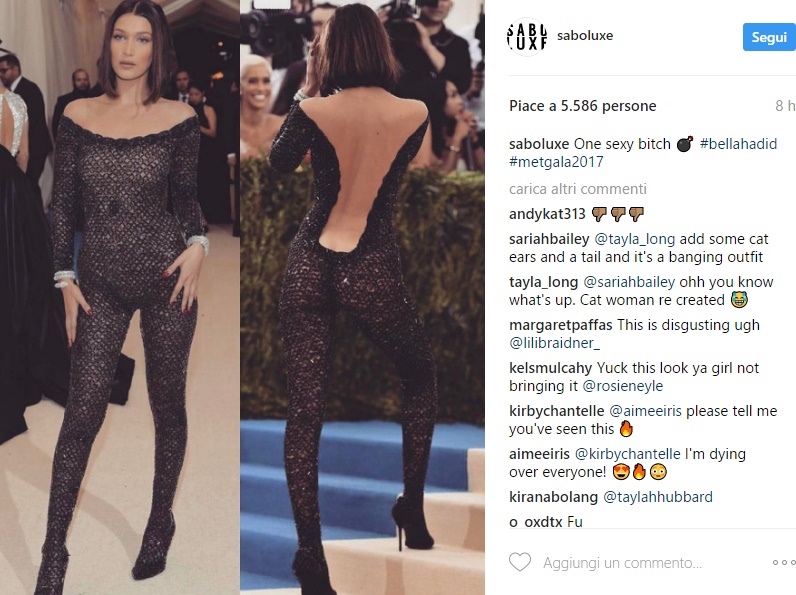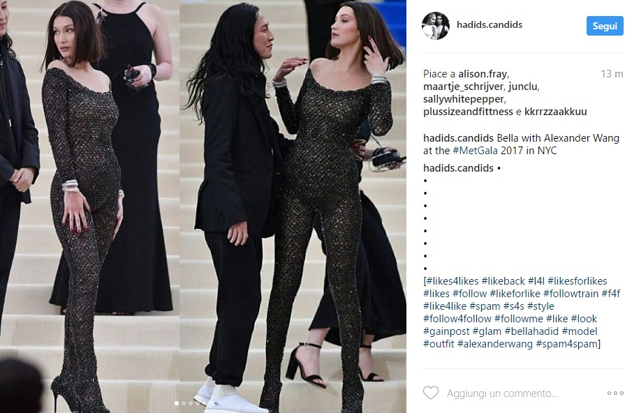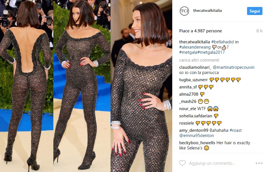 NEW YORK – Bella Hadid esagerata: tuta aderente al Met Gala FOTO. Se qualcuno avesse mai avuto perplessità sulla perfezione del fisico di Bella Hadid, il Met Gala 2017 è stata l’occasione per fugare ogni dubbio: la super modella si è mostrata all’evento dell’anno con una mise firmata Alexander Wang che ha letteralmente catalizzato l’attenzione dei fotografi: una tutina aderente effetto seconda pelle color grigio brillante con uno scollo vertiginoso sulla schiena che ha mandato in tilt il pubblico. Bella Hadid era bellissima e super glamour e la tuta ha messo in risalto il suo fisico slanciato e tonico.