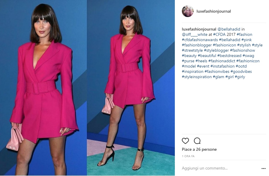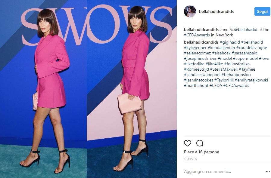 NEW YORK – Bella Hadid, sensuale con il completo fucsia FOTO. Glamour e super fashion, Bella Hadid ha conquistato tutti ai CFDA Awards 2017, dove vengono premiati i migliori talenti del mondo della moda, con un nuovo taglio di capelli e un completo fucsia firmato Off-white composto da un blazer con cinturone in vita. La super modella americana ha sfoggiato quello che, siamo certi, sarà il caschetto più copiato durante la prossima stagione estiva.