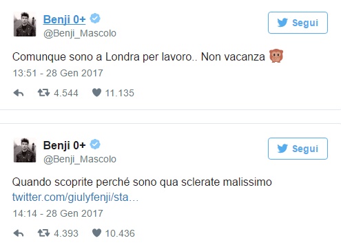 “Comunque sono a Londra per lavoro.. Non vacanza” e ancora “Quando scoprite perché sono qua sclerate malissimo”.