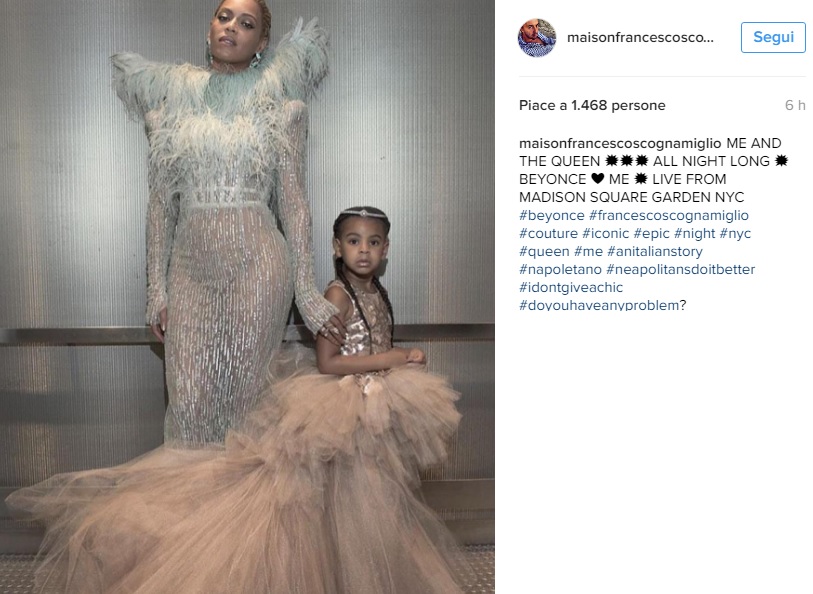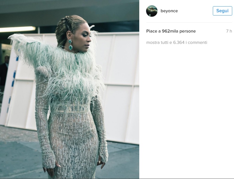 “Ciao Ciao Baby Blue! Siamo felici di annunciare l’arrivo della nostra bella figlia, Blue Ivy Carter, nata sabato 7 gennaio 2012. La sua nascita è stata emozionante ed estremamente tranquilla, siamo in paradiso. È venuta alla luce naturalmente e in salute col peso di 3,18 kg ed è stata la migliore esperienza di entrambe le nostre vite. Siamo grati a tutti per tutte le vostre preghiere, i buoni auguri, l’amore ed il supporto”. Di seguito una gallery con le foto di Beyoncé in Francesco Scognamiglio agli MTV Video Music Award 2016. (Instagram).
