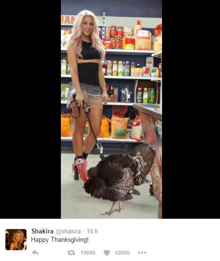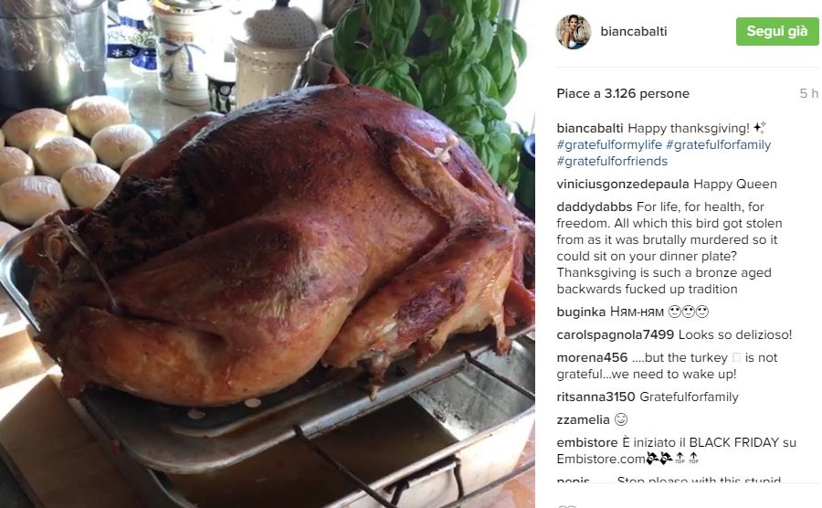 Nessun animale cotto a vista per la showgirl Elisabetta Canalis, che da qualche anno vive negli Stati Uniti. Solo foto in compagnia della famiglia. La modella Karlie Kloss ha optato per un piatto vegano, mentre Shakira ha pubblicato una singolare foto sul suo profilo Twitter in cui tiene col guinzaglio un tacchino vivo. Forse un invito a non mangiarlo? Difficile saperlo. Non è passato inosservata la foto della fidanzata di Meghan Markle, la nuova fidanzata del principe Harry. Colpa di uno scatto in cui si mostra al fianco di un tacchino cotto. Accoppiata” che non passerà inosservato agli occhi degli animalisti, nonché dei vegani.