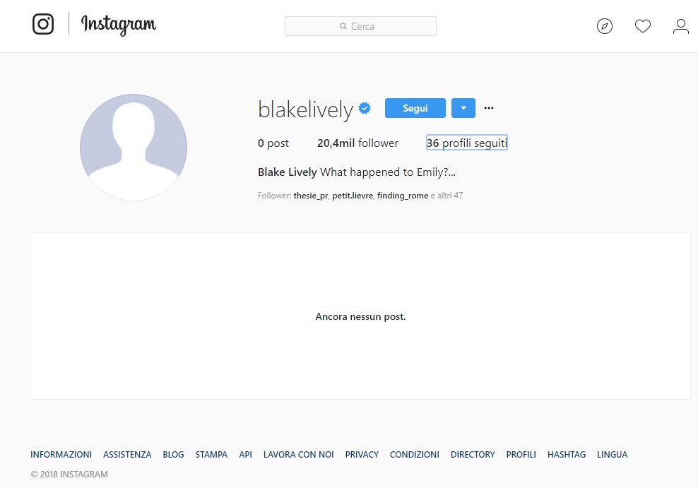 Ebbene, a quanto pare non c’è da preoccuparsi. Secondo i bene informati, infatti, potrebbe trattarsi di una mossa pubblicitaria per promuovere il suo prossimo film, A Simple Favor. Nel film, diretto da Paul Feig e con Anna Kendrick, la protagonista si chiama proprio Emily Nelson, e scompare all’improvviso. La descrizione dell’account di Blake Lively, non a caso, è: “Cosa è successo a Emily?”.