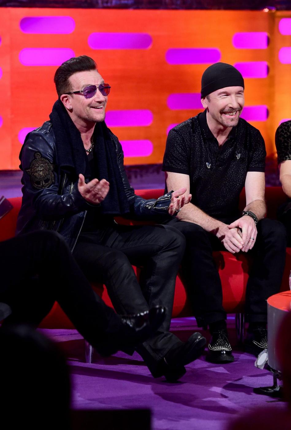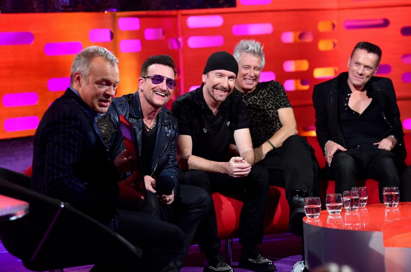 Gli U2 al Graham Norton showFile photo dated 16/10/14 of (left to right) Graham Norton, Bono, The Edge, Adam Clayton and Larry Mullen Jr during filming of the Graham Norton show, where U2 frontman Bono revealed he has suffered from glaucoma for many years, prompting his continual use of dark glasses. PRESS ASSOCIATION Photo. Issue date: Friday October 17, 2014. The star said he has had the condition - a build-up of pressure in the eyeball which can damage the optic nerve and lead to blindness if not treated - for around two decades. See PA story SHOWBIZ Bono. Photo credit should read: Ian West/PA Wire
