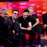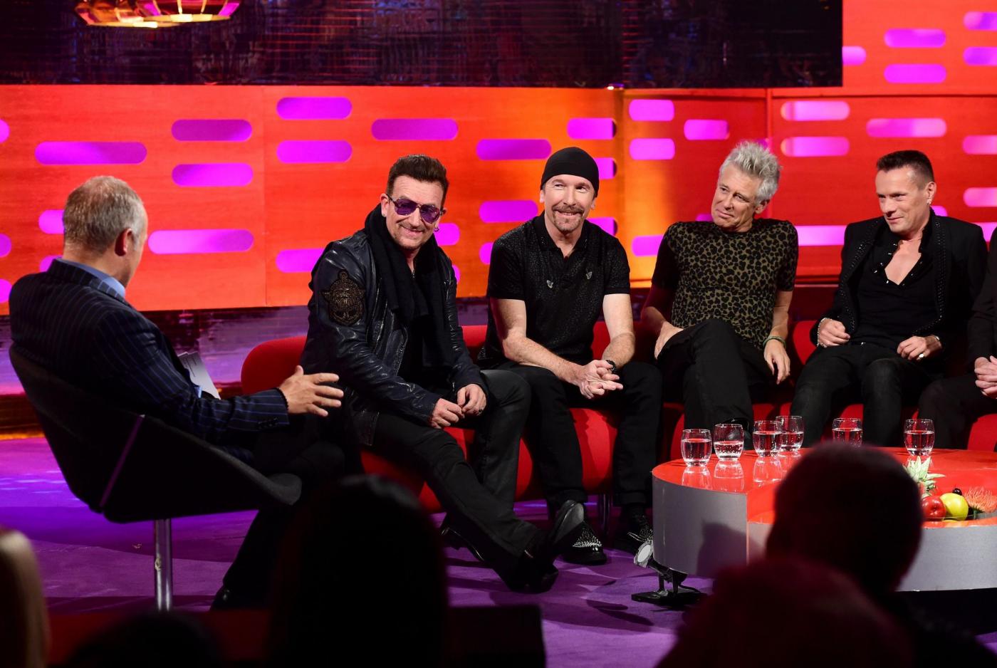 Gli U2 al Graham Norton show(left to right) Graham Norton, Bono, The Edge, Adam Clayton and Larry Mullen Jr during filming of the Graham Norton show, filmed at the London Studios, London, to be aired on BBC One on Friday evening. PRESS ASSOCIATION Photo. Picture date: Thursday October 16, 2014. Photo credit should read: Ian West/PA Wire LaPresse -- Only Italy