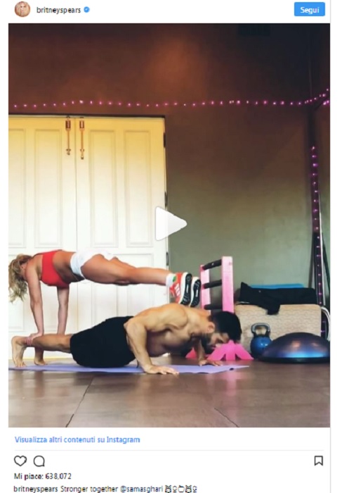 ROMA – Britney Spears è fidanzata col personal trainer Sam Asghari. I due, spesso si allenano insieme compiendo degli esercizi molto sensuali [App di Blitzquotidiano, gratis, clicca qui, Ladyblitz – Apps on Google Play]. Questa volta però, i due compiono qualcosa di spettacolare, circense per certi versi. La popstar dal fisico scolpito e il suo Sam, fanno infatti degli esercizi combinati che finiscono su Instagram facendo letteralmente impazzire i follower.