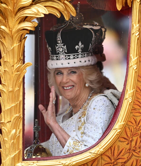 L’abito color avorio di Camilla, disegnato dal couturier e amico intimo Oldfield, che ha anche lavorato a stretto contatto con Lady Diana durante il suo periodo royal, è stato realizzato con peau de soie, un tessuto di seta. Il capo era impreziosito da ricami d’argento tessuti nell’azienda Stephen Walters, che ha sede nel Suffolk. Con una tavolozza di colori avorio, argento e oro, maniche lunghe fino al braccialetto, una spalla forte e un ampio scollo a V, l’abito era fedele allo stile di Camilla. La moglie di Carlo ha poi optato per delle scarpe realizzate dal designer britannico Elliot Zed, mentre al collo aveva una collana che la defunta regina Elisabetta mise per la propria incoronazione nel 1953.