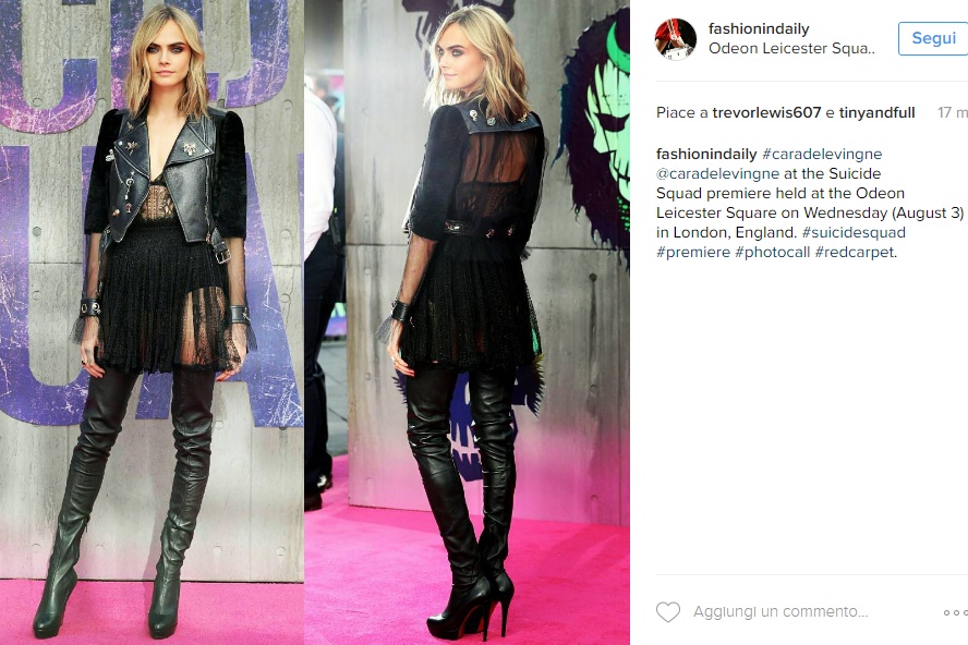 LONDRA – Cara Delevingne sensuale: trasparenze e stivali Louboutin FOTO. Cara Delevingne super sensuale in versione rock glamour per la prima mondiale dell’attesissimo film Suicide Squad. L’attrice ed ex modella, che vedremo nel film nei panni di Incantatrice, ha sfoggiato un look total black firmato Alexander McQueen e stivali di pelle altissimi Louboutin, con l’inconfondibile suola rossa a spezzare la mise. Abitino nero trasparente e giacca in pelle, make up incentrato soprattutto a valorizzare i bellissimi occhi chiari di Cara, l’attrice è apparsa incredibilmente fashion e sexy. La Delevingne è attualmente impegnatissima con le prime dell’attesissimo film Suicide Squad, che uscirà nella sale italiane il prossimo 13 agosto. Dopo molti anni nel campo della moda, meno di un anno fa l’ex modella ha dato addio alle passerelle per dedicarsi a quella che, secondo quanto dichiarato da lei stessa, è da sempre la sua vera passione: il cinema.