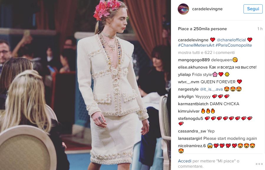 Il ritorno di Cara Delevingne in passerella è stato piuttosto inaspettato, dopo che aveva detto addio al mondo della moda lo scorso anno per dedicarsi al cinema. Era arrivata addirittura a “odiare” il suo corpo” e lo stress le ha scatenato una forte forma di psoriasi. Per poter sfilare ogni volta veniva ricoperta di fondotinta. Questo e la vita caotica della modella, continuamente in viaggio fra una metropoli e l’altra. Non solo: ha rivelato di essere entrata per un periodo nel tunnel della depressione di essere uscita solo grazie all’aiuto di Kate Moss.
