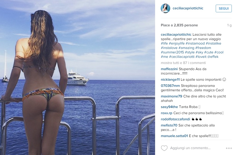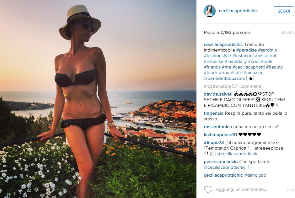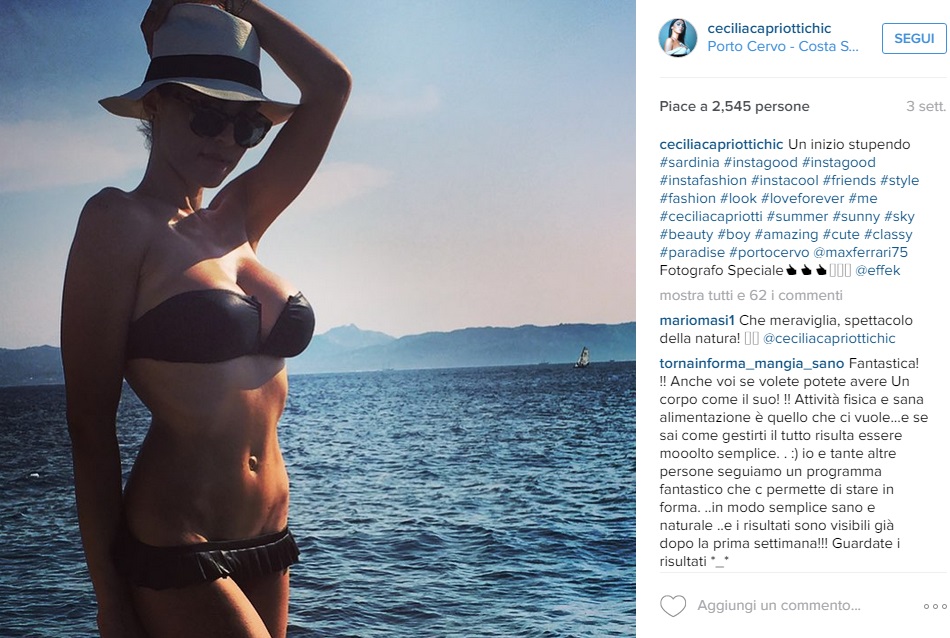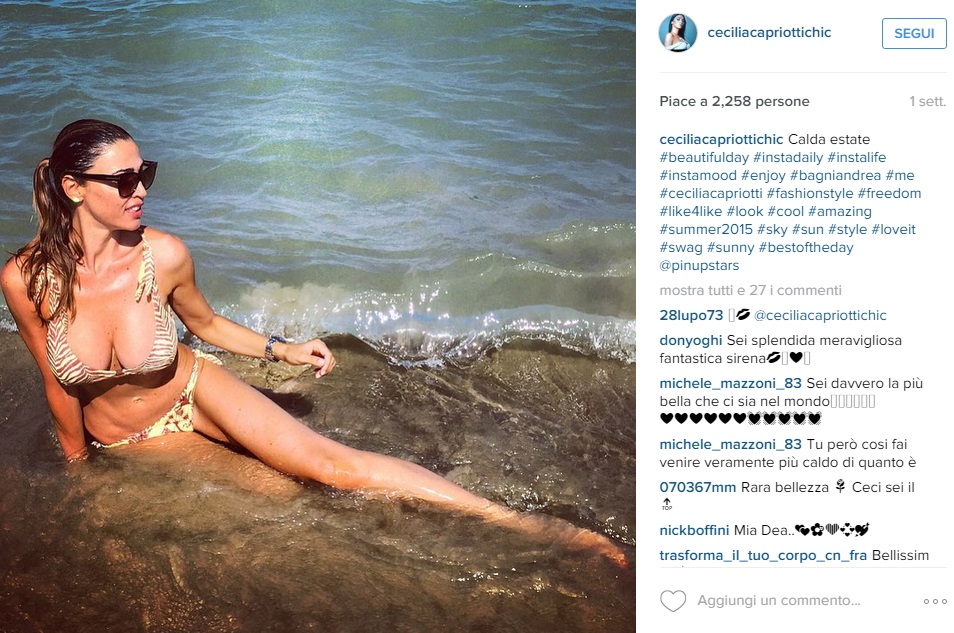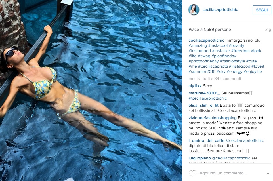 CAPRI – Cecilia Capriotti si sta godendo la gravidanza a Capri. Qui, la modella e showgirl 40enne sfoggia un seno materno incontenibile. In attesa del suo promo figlio, Cecilia continua a mettere in mostra le curve del suo décolleté. Una particolarità dello scatto diffuso da lei stessa attraverso i social è quel braccio, posizionato sul ventre come a volerlo proteggere. Bellissima e sempre sexy, la Capriotti si gode il mare ed ama passare le serate a party esclusivi.