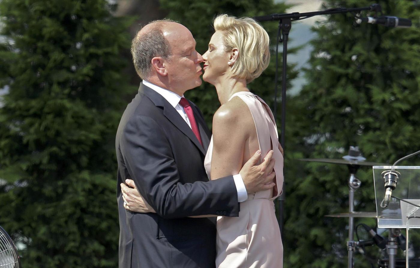 Prince Albert II of Monaco and his wife Princess Charlene embrace during the celebration of the 10th anniversary of his accession to the throne, Saturday, July 11, 2015, in Monaco. On 31 March 2005, the Palace of Monaco announced that Hereditary Prince Albert would take over the duties of his father as regent since Rainier was no longer able to exercise his functions as sovereign. On 6 April 2005, Prince Rainier III died and Hereditary Prince Albert became Albert II, Sovereign Prince of Monaco. REUTERS/Lionel Cironneau/Pool